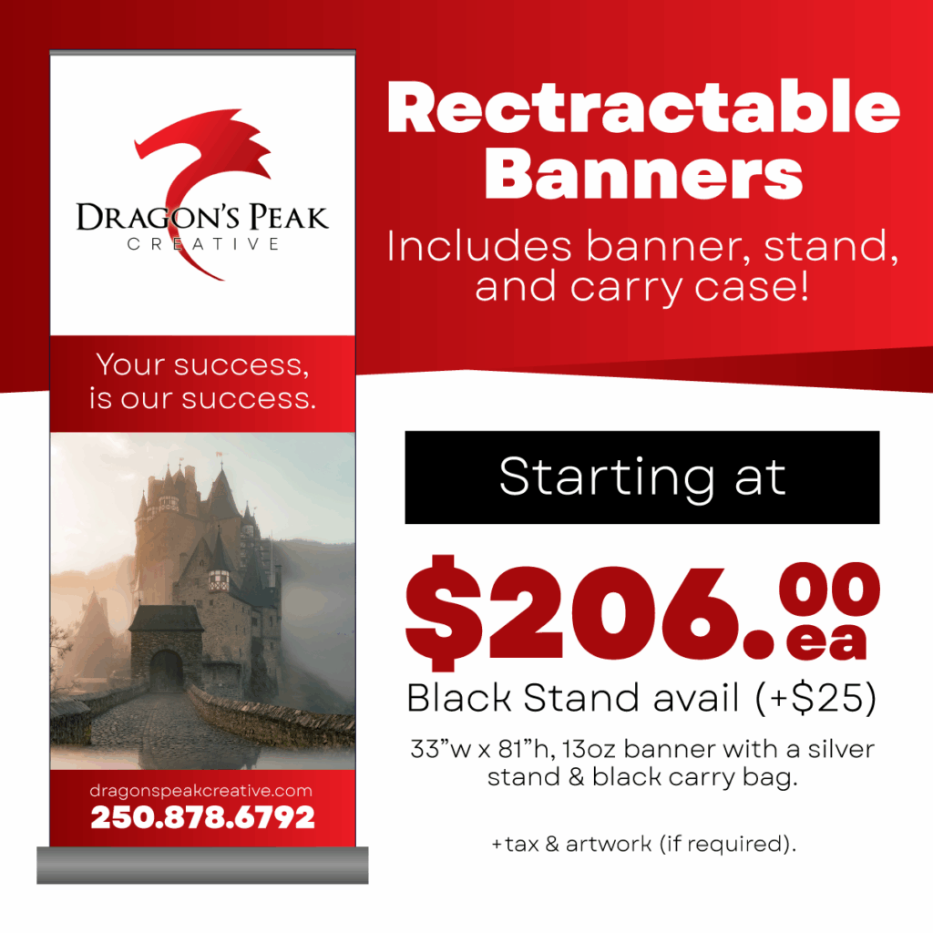 At Dragon’s Peak Creative, we bring your brand to life through stunning graphic design with signage, print, and vehicle graphics that captivate and convert. Let us help you stand out and grow your business with tailored design solutions. Your success, is our success!
